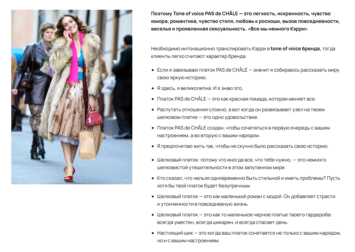 Например, для бренда шелковых платков мы разрабатали архетип (ниже покажу технологию), который включает в себя 3 архетипических начала: творец, маг, искатель. Подбираем схожий прототип известной личности (это может быть герой фильма, мультфильма, знаменитость или персонаж книги) - в нашей случае, такими же ведущими архетипами обладает известная героиня фильма "Секс в большом городе" Керри Брэдшою.